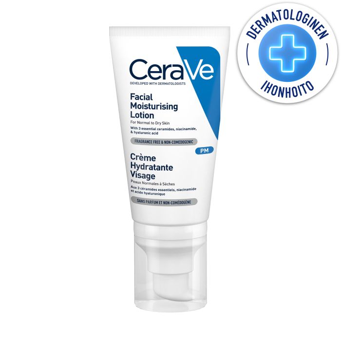 CeraVe Facial Moisturising Lotion har en otroligt lätt formula som snabbt tas upp av huden utan att kännas fet. Den hjälper till att återfukta huden och återställa dess skyddande barriärfunktion med hjälp av 3 essentiella ceramider (1, 3, 6-II). Förteckning över ingredienser: AQUA / WATER, GLYCERIN, CAPRYLIC/CAPRIC TRIGLYCERIDE, NIACINAMIDE, CETEARYL ALCOHOL, DIMETHICONE, PHENOXYETHANOL, CETEARETH-20, BEHENTRIMONIUM METHOSULFATE, CAPRYLYL GLYCOL, POLYGLYCERYL-3 DIISOSTEARATE, SODIUM LAUROYL LACTYLATE, POTASSIUM PHOSPHATE, DISODIUM EDTA, DIPOTASSIUM PHOSPHATE, CERAMIDE NP, CERAMIDE AP, PHYTOSPHINGOSINE, CHOLESTEROL, XANTHAN GUM, CARBOMER, ETHYLHEXYLGLYCERIN, SODIUM HYALURONATE, CERAMIDE EOP.