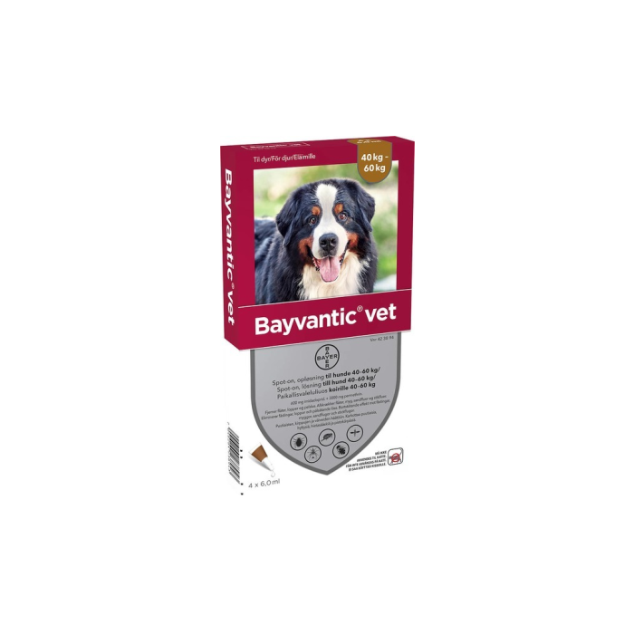 Bayvantic vet paikallisvaleluliuos koirille 40-60 kg on koirien ulkoloislääke, joka tehoaa ja antaa suojaa puutiaisia, hyttysiä, hietasääskiä, pistokärpäsiä ja kirppuja vastaan. Ulkoloisia tappava sekä karkottava vaikutus kestää jopa neljä viikkoa. Bayvanticin teho perustuu kahteen vaikuttavaan aineeseen, imidaklopridiin ja permetriiniin. Valmiste säilyttää tehonsa myös koiran kastuessa, esimerkiksi pesun aikana tai koiran uidessa.